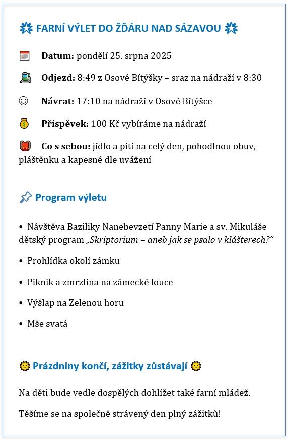 Srdečně zveme všechny děti od 1. třídy na celodenní farní výlet v pondělí 25. srpna jako krásné rozloučení s prázdninami. Mladší děti se mohou zúčastnit v doprovodu maminky či jiné dospělé osoby. Je možné se ještě přihlásit. Přesný program si vyzvedněte v neděli po mši v sakristii.