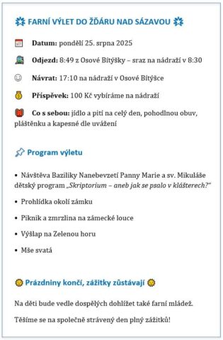 Srdečně zveme všechny děti od 1. třídy na celodenní farní výlet v pondělí 25. srpna jako krásné rozloučení s prázdninami. Mladší děti se mohou zúčastnit v doprovodu maminky či jiné dospělé osoby. Je možné se ještě přihlásit. Přesný program si vyzvedněte v neděli po mši v sakristii.
